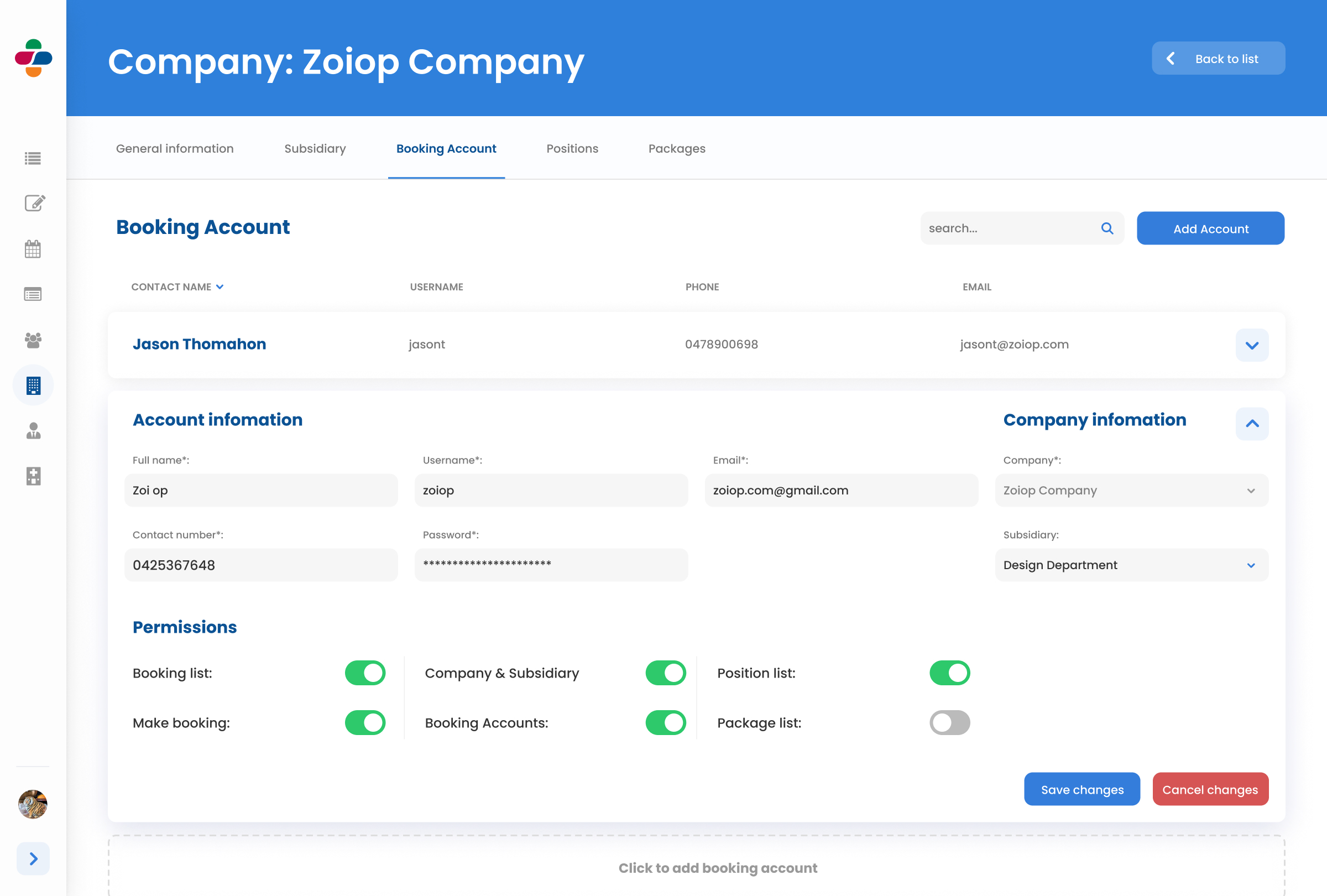 - Companies: manage company’s information which can be prefilled on the make booking feature.