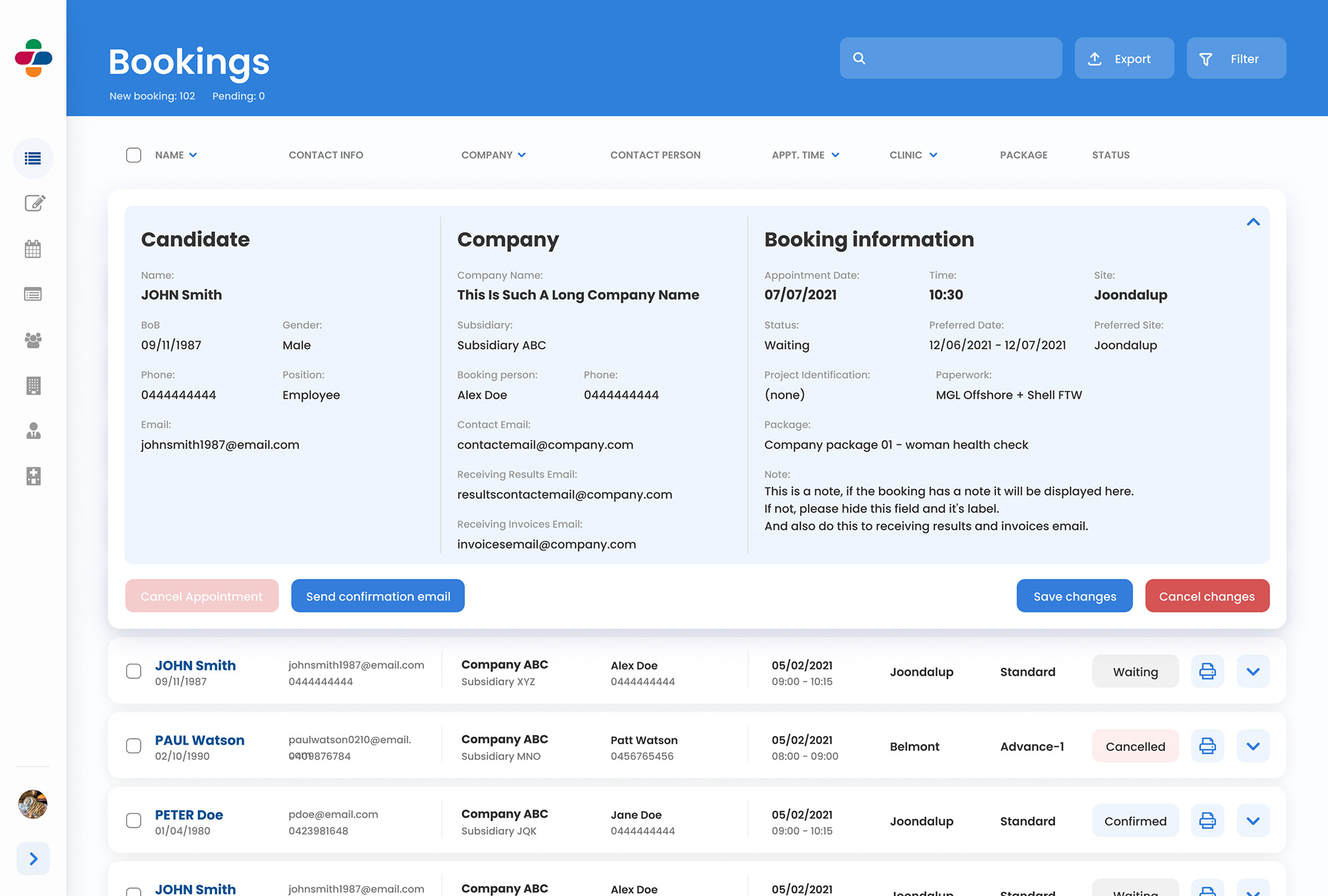 Following that, the main form was separated into 3 blocks: Company information – Booking Details – Candidates. Data input from the previous block affects data in the next one. For example, changing Company and Subsidiary could change the Paperworks and Package data in the Booking Details block, and also decide the clinic, available time slot in the last step.